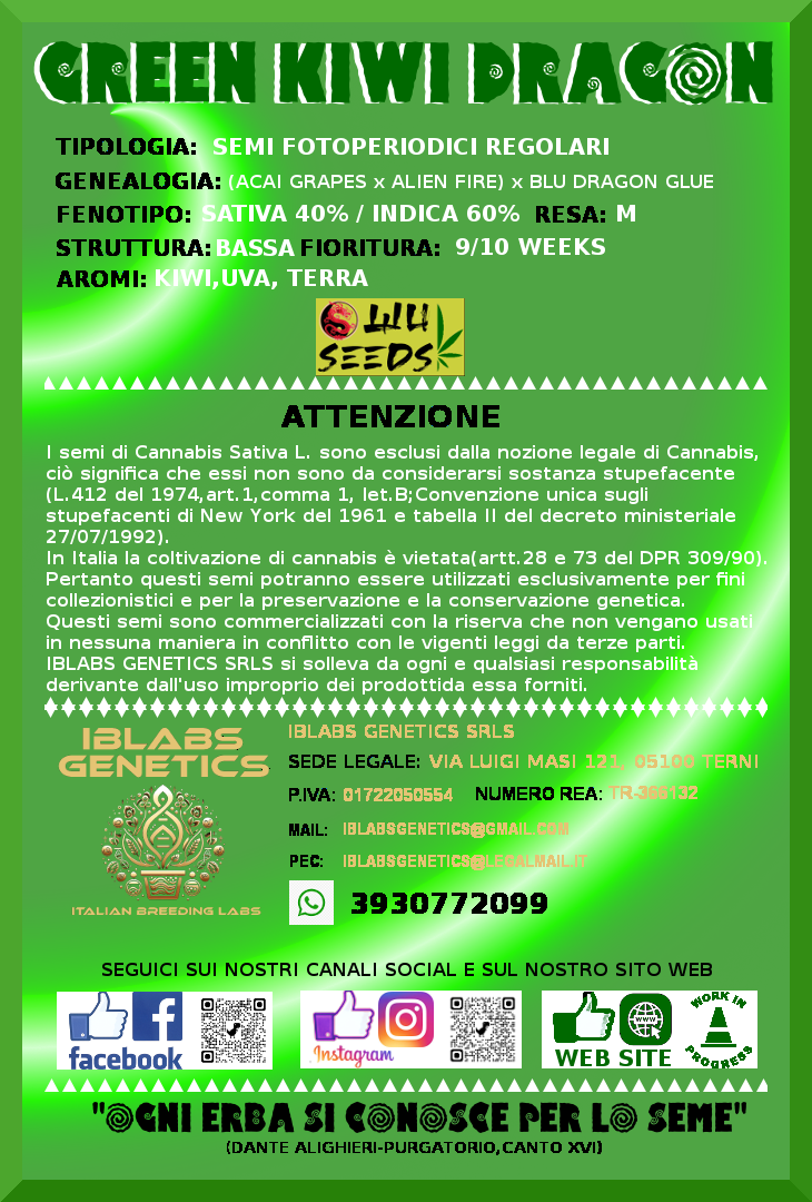 Therefore, these seeds may be used exclusively forcollection purposes and for genetic preservation and conservation.These seeds are marketed with the reservation that they will not be usedin any way that conflicts with current laws by third parties.IBLABS GENETICS SRLS disclaims any and all liabilityresulting from the improper use of the products it supplies.