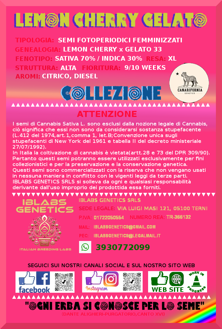 Therefore, these seeds may be used exclusively forcollection purposes and for genetic preservation and conservation.These seeds are marketed with the reservation that they will not be usedin any way that conflicts with current laws by third parties.IBLABS GENETICS SRLS disclaims any and all liabilityresulting from the improper use of the products it supplies.